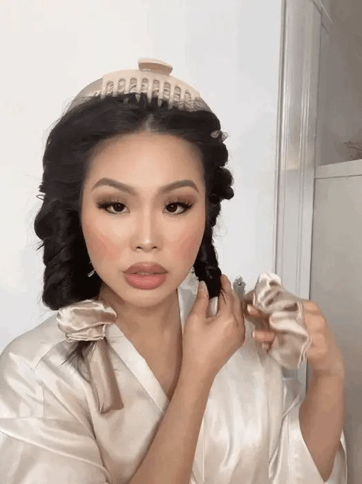 Position the silk rod on your crown and clip it. Divide hair into two sections, tying one side back for better control.